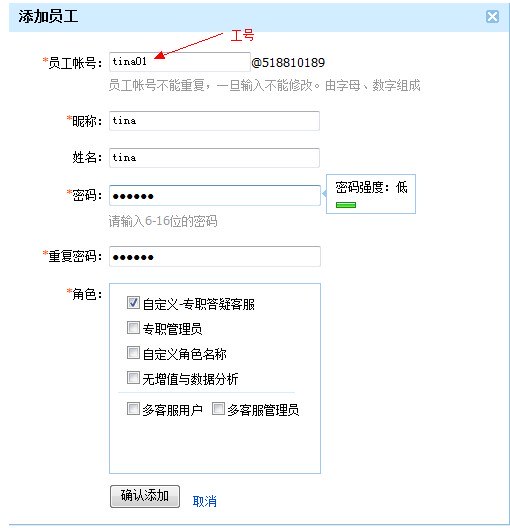 工號:工號是指開通多客服后添加工號時設置的工號,一般多客服登錄形式為 工號@主號,例如權限系統(tǒng)中添加工號為tina01,則登錄多客服時使用的賬號即為 tina01@518810189