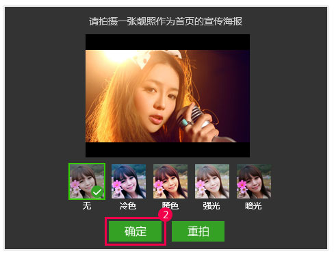3、選擇好視頻和音頻設(shè)備后,進(jìn)入直播海報(bào)的拍攝,同時(shí)選擇5種不同的濾鏡對(duì)海報(bào)進(jìn)行處理,上傳成功后便可開(kāi)始直播。 把直播地址(如: http://fanxing.kugou.com/1012043)發(fā)給好友,讓大家一起觀(guān)賞您的精彩直播。