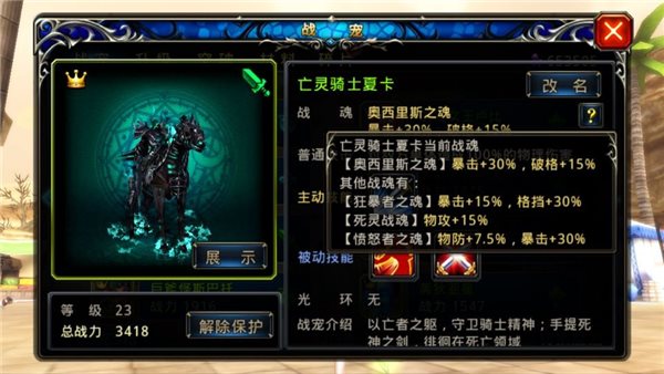 2、亡靈騎士:玩家在第二張副本地圖即可獲得的強(qiáng)力攻擊戰(zhàn)寵,主動(dòng)技能可以秒殺對(duì)方后排,即使在游戲中后期都很實(shí)用。