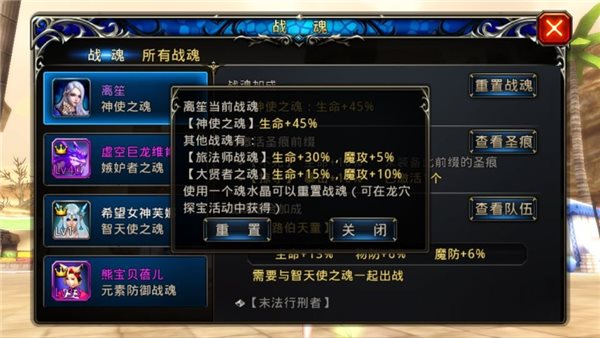 如圖:希望女神的戰(zhàn)魂是:智天使。而人物的戰(zhàn)魂是:神使之魂。 這2個(gè)的組合加成是:生命13% 物防6% 魔防6% 所以人物和希望女神都會(huì)獲得這個(gè)加成。
