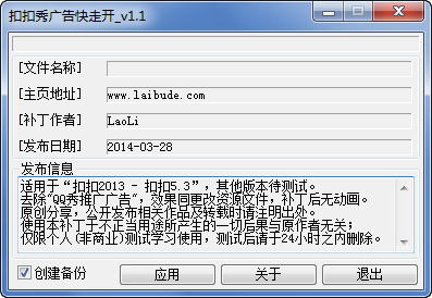QQ秀去廣告補(bǔ)丁就是個(gè)DLL補(bǔ)丁,無需更改資源文件,圖個(gè)方便!能夠去除“QQ秀推廣廣告”,效果同更改資源文件,補(bǔ)丁后無動(dòng)畫。