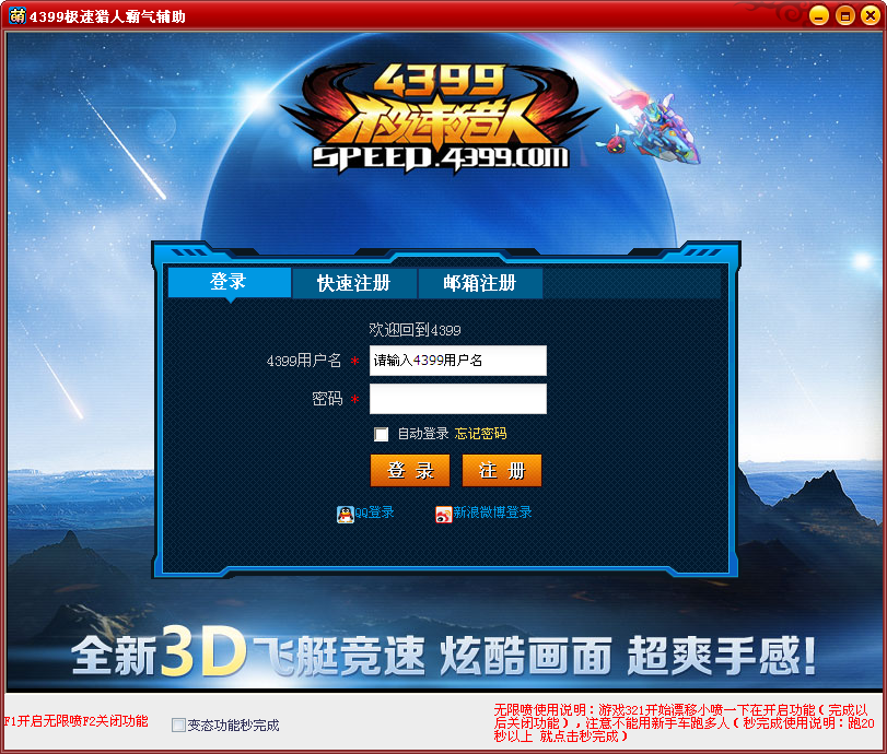 極速獵人霸氣輔助是適用于同名游戲《極速獵人》的一款輔助工具。極速獵人是由4399代理的一款3D飛行競(jìng)速游戲,非常刺激給力。使用這款極速獵人輔助可以開啟碰撞滿氮?dú)狻o(wú)限噴、自動(dòng)放道具等功能。讓您擁有每場(chǎng)必勝的實(shí)力。