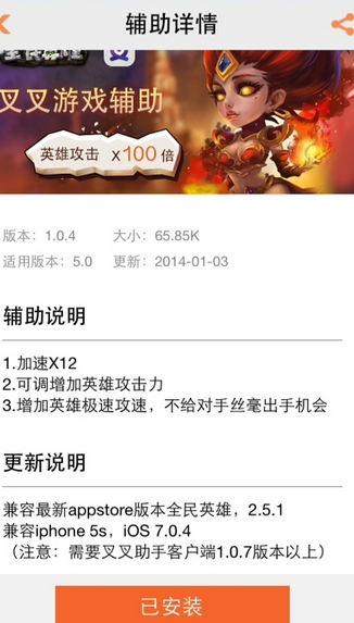叉叉全民英雄助手ios下載 1.1.0 最新版 叉叉全民英雄助手ios是用于iphone手機(jī)的一款全民英雄輔助。本軟件擁有游戲加速、攻擊前模式調(diào)整和極速攻擊等功能。支持最新版全民英雄使用,防封號。小伙伴們趕快來體驗(yàn)每盤都勝利的快感與喜悅。