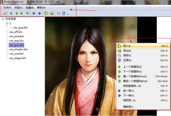 路徑指定正確后,點(diǎn)左上角的打開按鈕,工具會(huì)搜索指定目錄下所有bin文件,點(diǎn)選其中一個(gè)項(xiàng)目,就可以查看圖片資源了