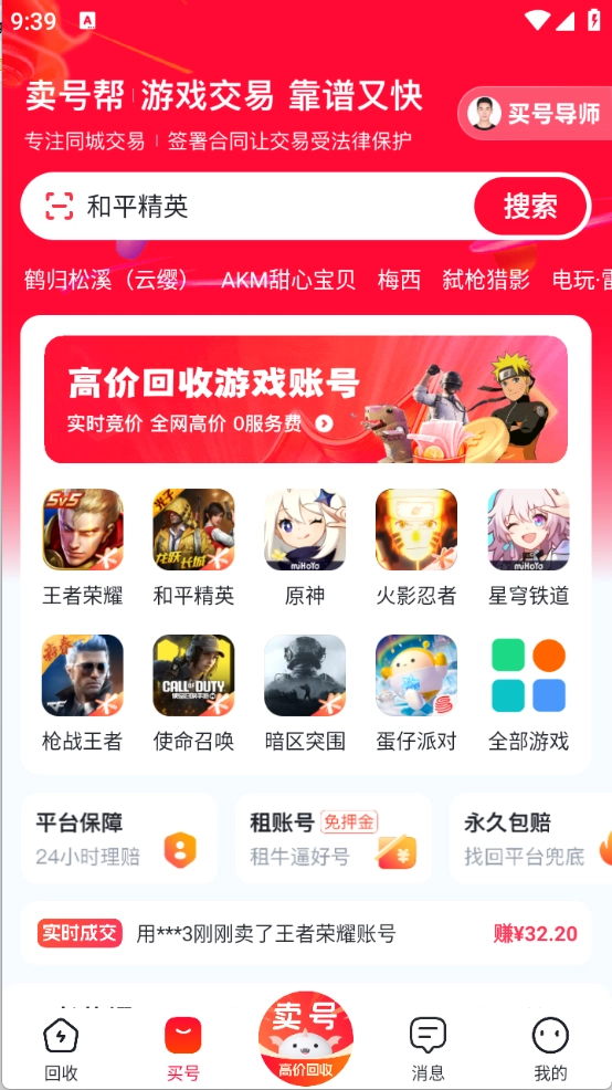進入首頁后,能看到不少熱門游戲賬號推薦,像王者榮耀、和平精英和蛋仔派對之類的都在其中。