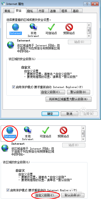 選項(xiàng)窗口打開后,選擇第二個(gè)選項(xiàng)卡 安全,選中第一項(xiàng)Internet,點(diǎn)擊自定義級(jí)別按鈕。