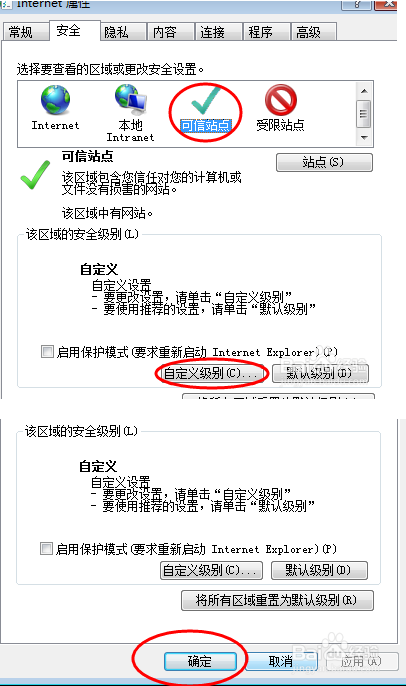 返回主界面后,選中第三項(xiàng) 可信站點(diǎn),點(diǎn)擊 自定義級(jí)別,打開設(shè)置窗口后,參數(shù)如3步驟相同設(shè)置,確定。