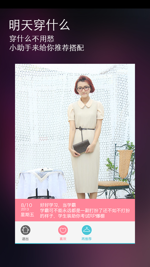 你還在淘單品嗎?Out了!快來淘搭配吧!這是一款穿衣搭配利器。喜歡上那個姑娘分享的搭配怎么辦?查看她在哪里買的,喜歡你也可以買回家!只要您把自己的穿衣搭配發(fā)到穿衣助手社區(qū),就可以得到別人對這身搭配的贊率統(tǒng)計哦,這樣可以接改善不會搭配的情況,快來下載體驗吧。