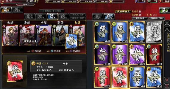 攻擊:高級(+20%知略)偃月虎韜;中級(10%知略):衡軛鋒矢;初級:鶴翼、縱陣