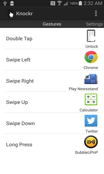 Knockr允許用戶采用OLED屏幕設(shè)備,如三星Galaxy S5和極限摩托,快速輸入與手勢(shì)的應(yīng)用程序,而無(wú)需打開(kāi)屏幕。 OLED屏使這成為可能,因?yàn)楫?dāng)像素是黑色的該象素被關(guān)閉,因此,當(dāng)整個(gè)屏幕是黑的屏幕被關(guān)閉。