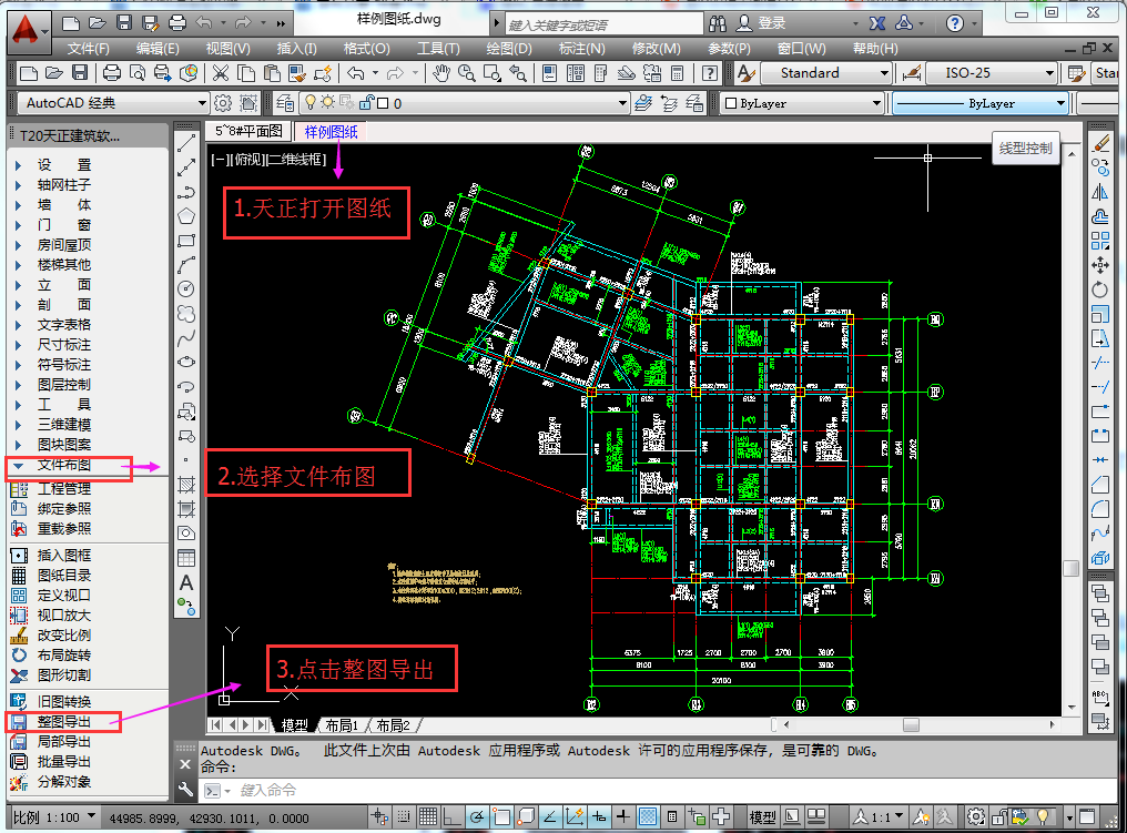 一般圖紙顯示不全主要是圖紙版本問(wèn)題,如圖紙是由較高版本的CAD或天正繪制,此時(shí)建議用戶使用天正直接將圖紙導(dǎo)成T3格式,具體操作如下: