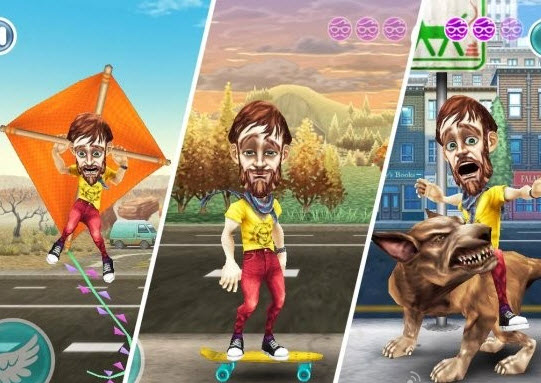 一路飛行過程中,使用飛翔會不斷消耗能量,需要收集到空中那些藍色光環(huán)的翅膀才能補充,否則能量一旦用完主角就會只能在大馬路上挺尸了。在關(guān)卡模式下只要順利到達終點綠線就算成功,正好趕上漢堡外賣車,看看小青年一臉賊笑就知道了。
