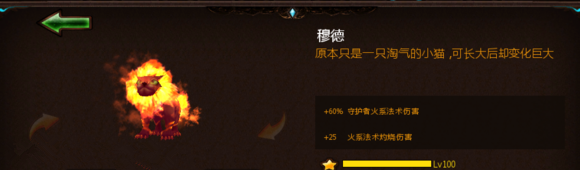 火系寵物,會(huì)釋放火焰怒吼,并根據(jù)與寵物的親密度帶來(lái)10%-60%火系傷害加成。