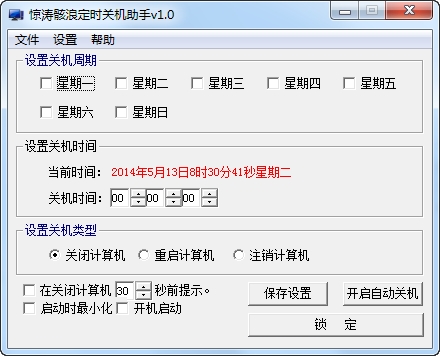 驚濤骸浪定時(shí)關(guān)機(jī)助手是一款功能強(qiáng)大的電腦定時(shí)關(guān)機(jī)軟件,這款定時(shí)關(guān)機(jī)軟件能夠自定義關(guān)機(jī)時(shí)間,還有日期,對(duì)于那些睡前喜歡看看電影聽聽歌的朋友來說,是一款非常值得收藏的軟件。
