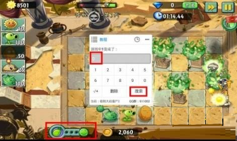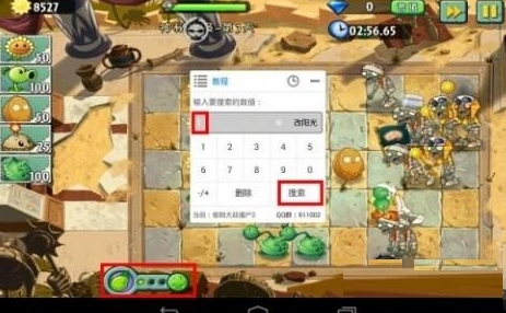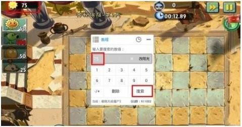 然后大家一定要盡量種更多的植物,防止游戲結束。接著第一次不要搜索0,等到吃到第一個能量豆后,點擊葫蘆俠的小圖標,搜索1,然后返回游戲。注意:不用勾選那個改陽光的選項。