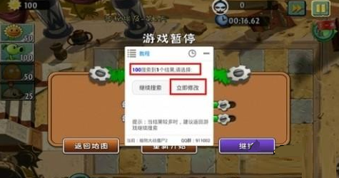 點搜索,如果搜索結果較多,就返回游戲,等陽光變化后再搜索。如圖中,變化后,搜索的是100,當前找到了一個結果可以修改了,然后點擊“立即修改”。