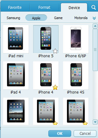3、在彈出的輸出格式窗口中,選擇您需要的視頻格式。你也直接可以選擇設備名稱作為輸出格式。事先進行了優(yōu)化的輸出的視頻設置。