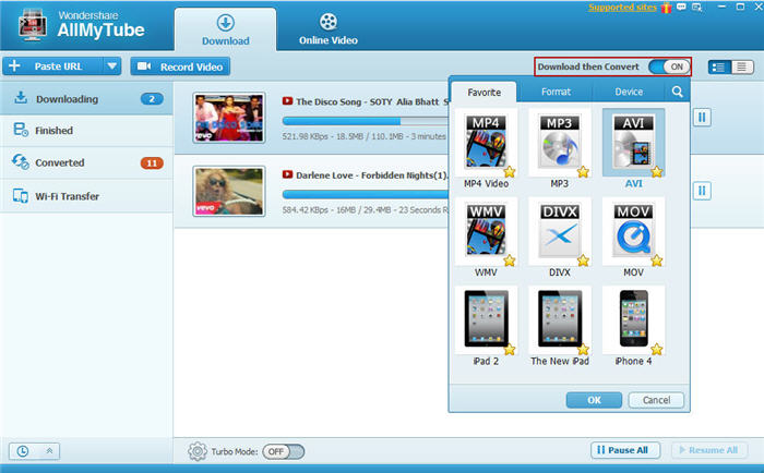 如果你想要同時下載和視頻轉換到特定的格式,再打開開關位于主窗口的右上角的"下載然后轉換"開關。將顯示列表的輸出格式。選擇您所需的輸出格式。就是這樣?,F(xiàn)在,您可以下載視頻使用第 1 部分中所提到的方法之一,AllMyTube 將自動轉換為您需要的格式。