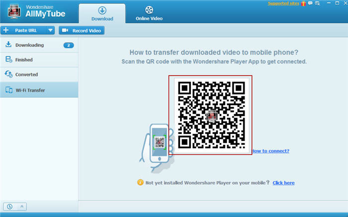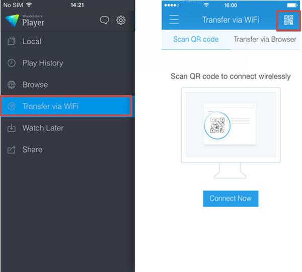 一旦它安裝在您的移動設備上啟動 Wondershare Player 的應用程序。然后選擇通過 WiFi 選項轉移并使用掃描儀掃描 QR 代碼表明你 AllMyTube 連接菜單上建立數(shù)據(jù)傳輸連接通過您現(xiàn)有的 Wifi 網(wǎng)絡。