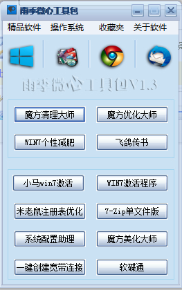 雨季微心系統(tǒng)工具包是款界面精美、功能強大、操作簡單、內(nèi)容齊全、體積苗條的工具箱,。綠色清爽,單文件,方便攜帶、饋贈親友,更為你封裝的系統(tǒng)增添一道亮麗的風(fēng)景線。 雨季微心系統(tǒng)工具包聚合了多個電視電影及音樂頻道,近百項功能設(shè)置。以及穩(wěn)定系統(tǒng)推薦雨季微心工具箱全面支持主流操作系統(tǒng),功能完善,是計算機愛好者的必備利器。【更新日志】