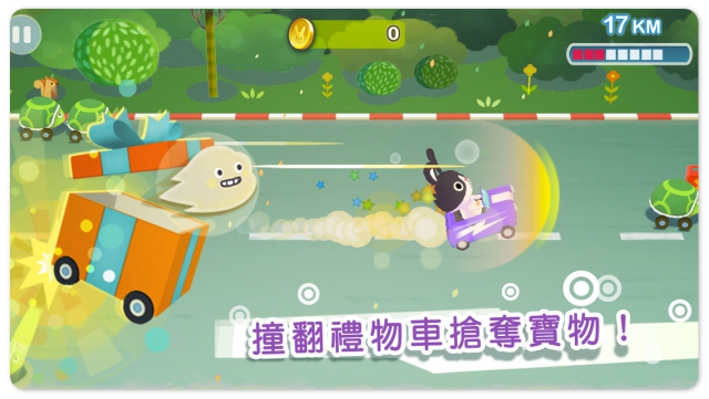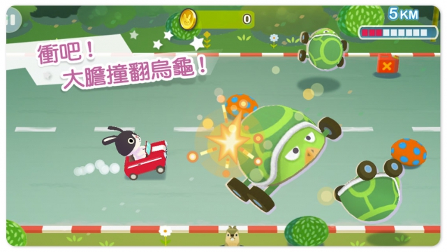 本作比較適合兒童,操作自然不會復(fù)雜,左手按主屏幕,上下滑動控制車子的方向,右手持續(xù)按住屏幕,使車子加速行駛。簡單的操作就可以開始一場全新的龜兔比賽,操作流暢度高,但太靈活的操作,有時卻是游戲的難點。
