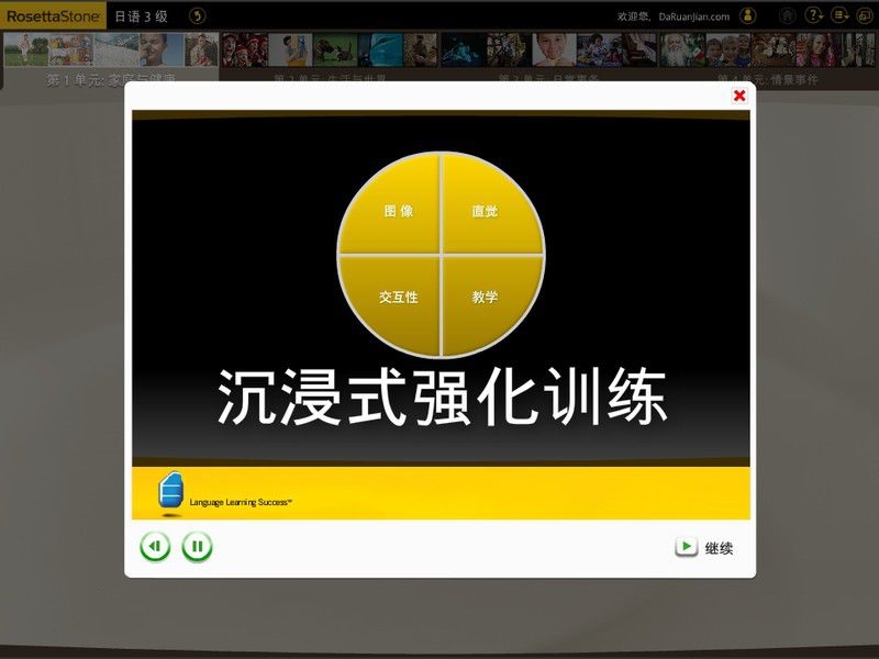 圖像化、直覺化、游戲式的學(xué)習(xí)界面和過程,不再有枯燥無味的翻譯和背誦,學(xué)習(xí)語言也輕松!您覺得學(xué)語言好難?您曾經(jīng)失敗過許多次?您急需學(xué)會某種語言?讓如師通幫助您實現(xiàn)美好的夢想,您能做到!Dynamic Immersion? Method (沉浸式強化訓(xùn)練法)孩提時,您完全沉浸在自己的母語環(huán)境中,在不斷將看到的圖像與單詞、短語聯(lián)系的過程中,逐漸地學(xué)會了自己的第一門語言——母語。這種方法是簡單的,就因為它是自然的,而且能使大腦接受更加復(fù)雜的語言難度?! ?br />美國Rosetta Stone語言科技公司自主發(fā)明的Dynamic Immersion? Method(沉浸式強化訓(xùn)練法),通過計算機網(wǎng)絡(luò)技術(shù)模擬了母語般的環(huán)境以及學(xué)母語的自然過程。其簡單的、直覺化的學(xué)習(xí)界面和所運用的先進技術(shù),使您將已理解的圖像和所學(xué)新語言不斷建立聯(lián)系,從而鞏固了語言學(xué)習(xí)的每一步。軟件提供的及時反饋能有效地強化學(xué)習(xí)效果。系統(tǒng)性的課程結(jié)構(gòu),能使您從簡單的名詞和動詞,快速提升到復(fù)雜的概念和語句,幫助您以超乎想象的速度實現(xiàn)語言學(xué)習(xí)的目標!