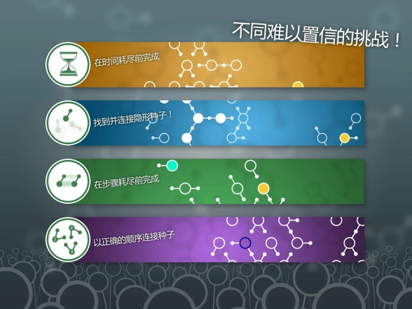 蒲公英的種子鏈游戲設(shè)有3個花世界以及60個禪關(guān)卡。體驗美麗的超現(xiàn)實世界并在置身于催眠風鈴中。當您解開新的挑戰(zhàn)和環(huán)境時,請輸入您的寧靜海。您可以使用不同的解謎策略重玩此關(guān)卡。這個游戲的玩法雖然是一個連接游戲,但游戲營造出來的一個游戲世界很不同,特別是在背景音樂的襯托下,很安靜,很舒心。【游戲特點】