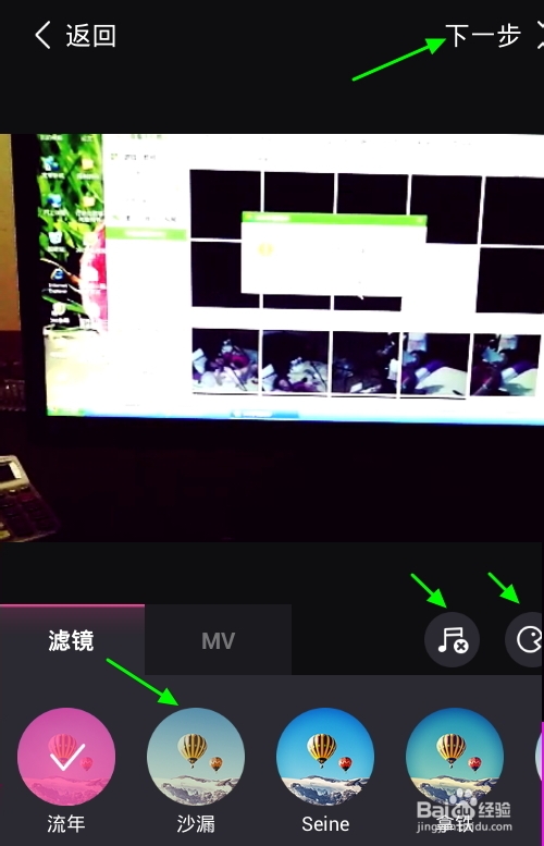 登陸之后,點(diǎn)擊中間的攝像按鈕開始攝像,攝像完畢后可以選擇下方“濾鏡”進(jìn)行切換,還可以點(diǎn)擊音樂圖標(biāo)配音,或點(diǎn)擊邊上的按鈕消除原音,調(diào)試好了后,點(diǎn)擊下一步進(jìn)入分享。