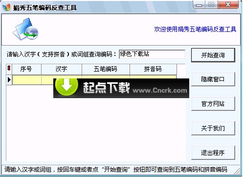 娟秀五筆編碼反查工具 V1.1.2 綠色免費(fèi)版 娟秀五筆編碼反查工具是一款五筆編碼、拼音碼反查的免費(fèi)應(yīng)用軟件。