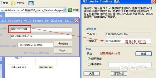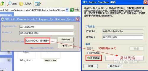 將剛才復制的產(chǎn)品碼粘貼到這里。并點擊“Generate”按鈕,會生成注冊碼和手動激活碼。