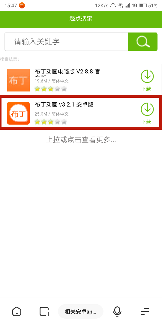 2.進入起點后搜索布丁動畫,然后點擊第二個進入下載頁面