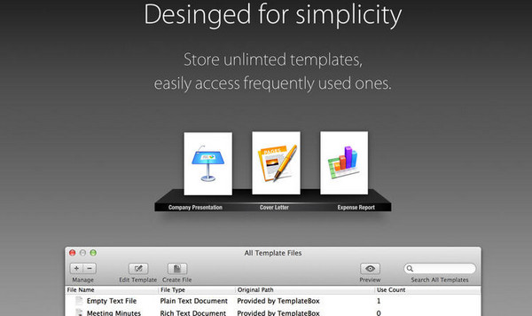 TemplateBox mac版是一款快捷高效的文檔管理軟件,適用于ios、mac系統(tǒng)。你可以用TemplateBox對(duì)自己的文件夾進(jìn)行快速、輕松、準(zhǔn)確的文檔操作,即方便又高效,歡迎下載使用。