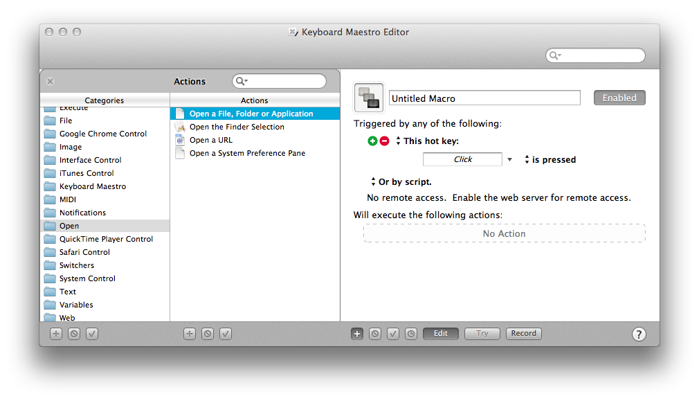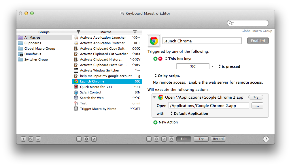 使用KM來設(shè)置調(diào)用應(yīng)用程序的Macro是我的首要需求,這里首先在Macros列表里新建一個(gè)Macro,然后點(diǎn)擊“New Trigger”按鈕,在Trigger列表里選擇“Hot Key Trigger”,設(shè)置好熱鍵后(例:?+c),點(diǎn)擊“New Action”按鈕,在Actions列表里找到“Open-Open a File,Folder or Application”,雙擊,將此Action添加進(jìn)去,選擇好“Chrome.app”,完成創(chuàng)建,這樣在全局下使用?+c就能啟動(dòng)Chrome了。