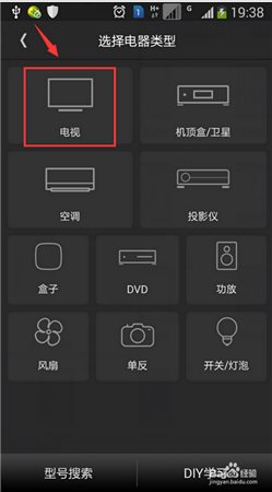 3、在“選擇電器類型”界面,可以看到app支持的所有產(chǎn)品設(shè)備,包括:電視、空調(diào)、風扇、投影儀等設(shè)備。我們選擇“電視”進入下一步。