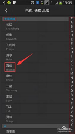 4、“選擇品牌”界面列出所有國內(nèi)電視品牌,最上方是主流品牌??赏ㄟ^右側(cè)字母來快速定位電視品牌。我們選擇“海信”進入下一步。