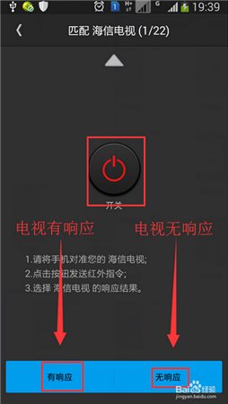 5、“匹配”界面,按照屏幕提示,用手機對準目標設(shè)備點擊屏幕按鈕,進行測試,設(shè)備正確響應(yīng)后選擇“有響應(yīng)”,反之選擇“無響應(yīng)”。多個按鈕測試完成后,就會生成正確匹配設(shè)備的遙控器,我們就可以用該遙控器來控制設(shè)備了。