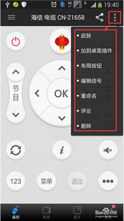 6、在遙控器界面上,點擊右側(cè)按鈕即可管理遙控器??蓪b控器的皮膚、按鈕位置、按鈕信息等信息進行編輯??梢詫斍斑b控器以組、件形式添加到手機桌面。使用更加便捷。添加方法:選擇菜單中添加到插件后,在手機桌面空白處長按即可出現(xiàn)插、件添加選擇,然后找到該組件拖放到桌面即可。