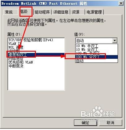 4、手動(dòng)設(shè)置網(wǎng)卡。在“設(shè)備管理器”里找到你的網(wǎng)卡,然后點(diǎn)擊“屬性”、再找到“高級(jí)”選項(xiàng)卡,在列表菜單中找到“速度和雙工”,設(shè)置為“100M 全雙工”。
