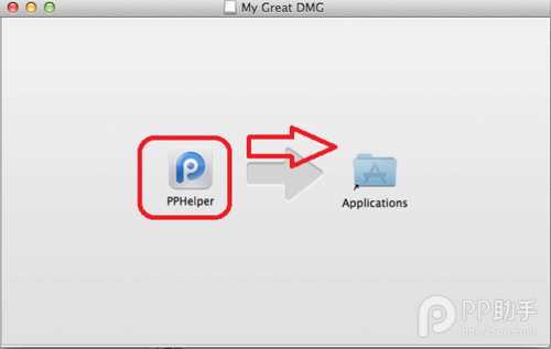 1、下載好安裝包后雙擊打開,然后將PP助手的圖標(biāo)拖到Applications的文件夾里就可以完成安裝操作。