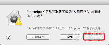 5、更改之后在打開PP助手,出現(xiàn)“PPHelper”是從互聯(lián)網(wǎng)下載的“應(yīng)用程序”。您確定要打開嗎? 的提示后,點擊打開。
