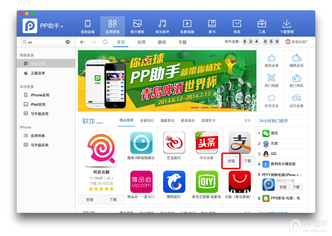 6、打開后簡介的的PP助手界面,連接好IOS設(shè)備之后,可以在正版應(yīng)用或者越獄應(yīng)用里面下載豐富的應(yīng)用。