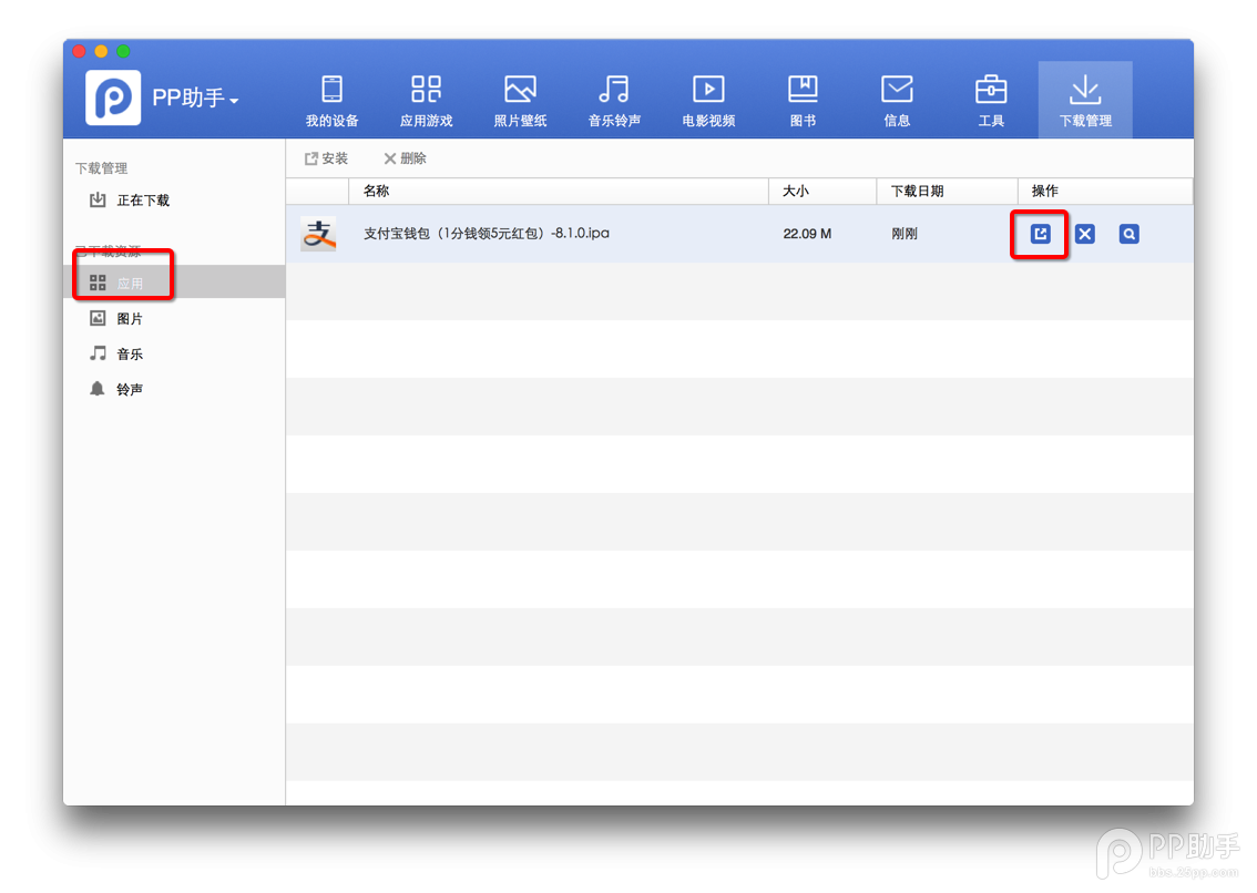 8、下載完成后,在資源管理--下載管理--已下載就可以看到下載好的程序,點擊安裝按鈕就可以安裝到IOS設(shè)備中使用了。