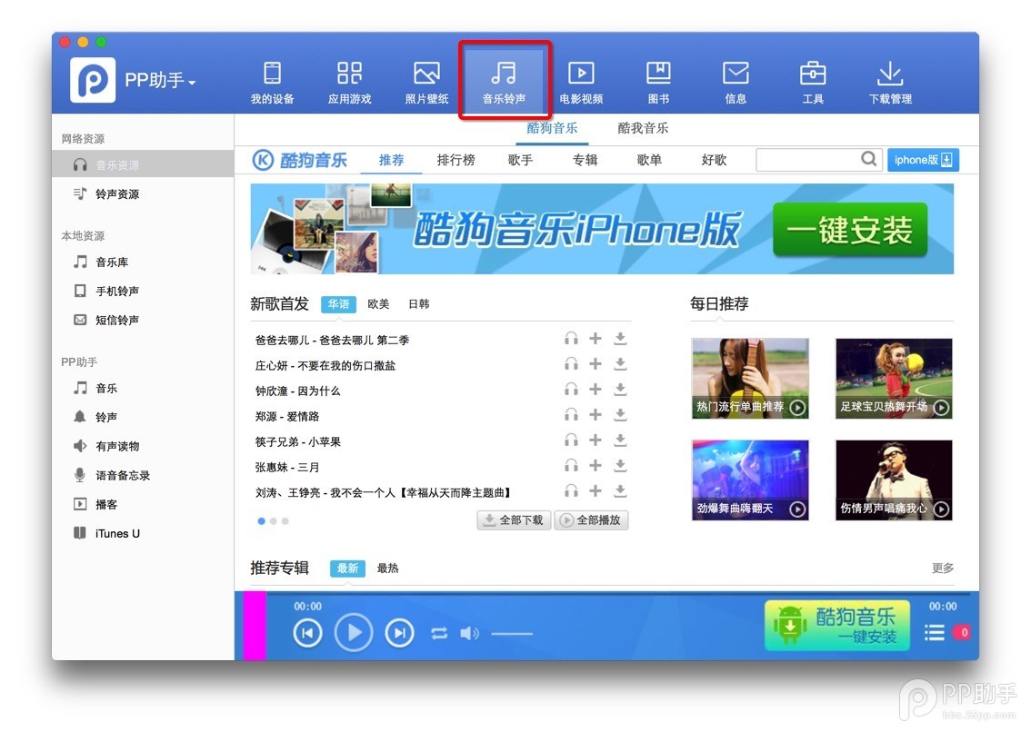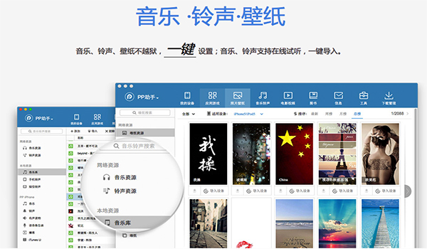 9、全新的多媒體模塊,支持音樂/鈴聲下載和導(dǎo)入,點擊PP助手上的【 音樂鈴聲】即可快速搜索您想要任何