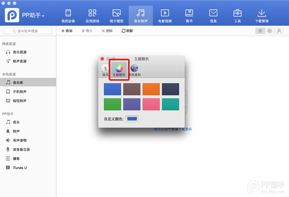 10、新增主題模塊,讓您隨意切換不同的色彩主題,更支持自定義主題,點擊【PP助手】- 【偏好設(shè)置】-【主題模塊】,進(jìn)行更換主題: