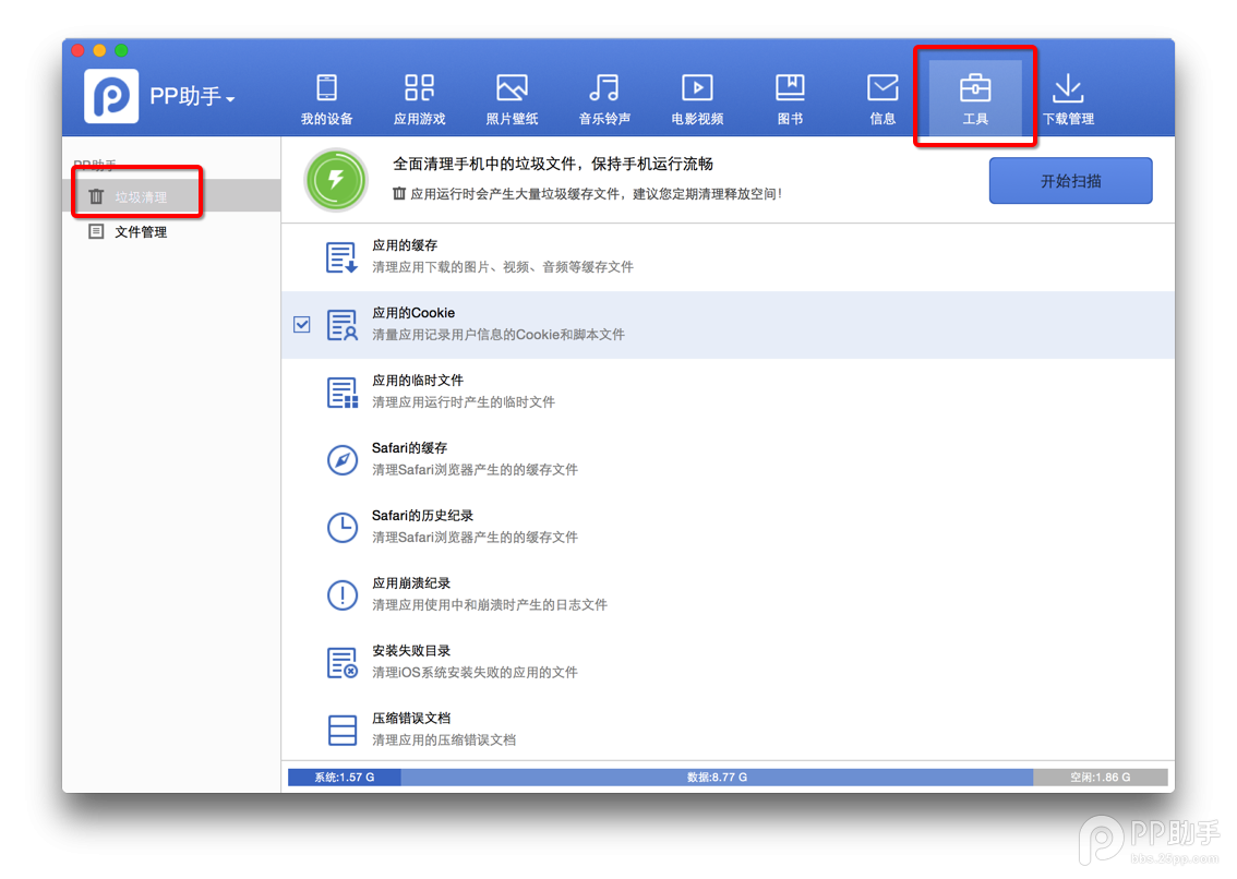 11、垃圾清理功能:點擊PP助手上的【工具】-【垃圾清理】,即可對手機(jī)上的緩存文件及垃圾文件進(jìn)行清理喔: