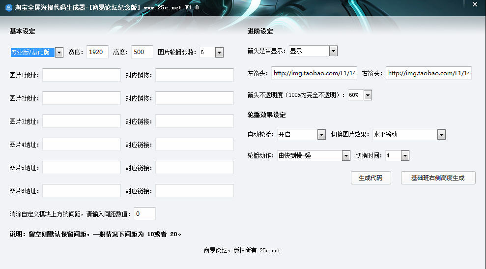 淘寶網(wǎng)店全屏海報代碼生成器 v1.0 綠色免費版 很多淘寶店主喜歡在裝修店鋪的時候使用全屏海報,這款全屏海報代碼生成器就是必備之淘寶店鋪裝修代碼,可以自動生成代碼,沒有網(wǎng)頁設計基礎的人也能使用,給力!