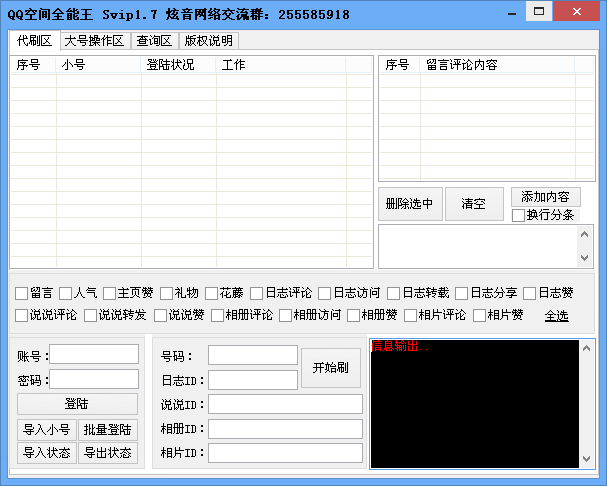 炫音QQ空間全能王svip是一款空間全能輔助工具,登錄后可以一鍵讀取QQ空間里的內(nèi)容,包括留言、日志評論、日志轉(zhuǎn)載、說說評論、說說贊、空間禮物等等共38項功能,簡單又方便。