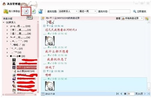 然后會進入到信息管理器頁面。這里點擊其他的好友也訥訥感看到和其他聯(lián)系人的對話。然后點擊左上角的刪除。