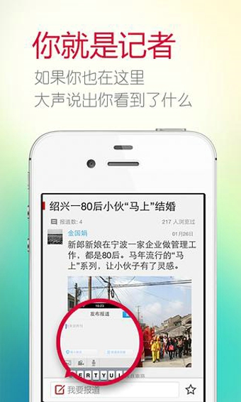 我的現(xiàn)場——發(fā)現(xiàn)身邊事,創(chuàng)建個人現(xiàn)場,存在感噌噌UP~剛COS了一回柯南君,整個人就變身一新聞大磁鐵!只要有圖有真相,“我在現(xiàn)場”就支持你用事件真相發(fā)聲,享受LIVE的非凡快感!