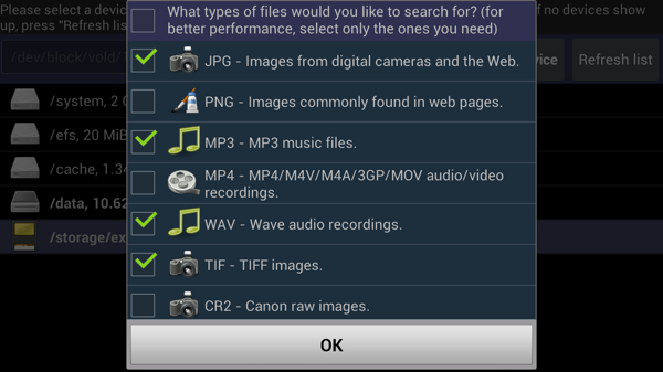 DiskDigger恢復(fù)下列類型的文件:JPG,PNG,MP4 / M4A / 3GP / MOV,GIF,MP3,AMR,WAV,TIF,CR2,SR2,NEF,DCR,PEF,DNG,ORF,DOC / DOCX,XLS / XLSX ,PPT / PPTX,PDF,XPS,ODT / ODS / ODP /總干事辦公室,郵政編碼,APK,EPUB。